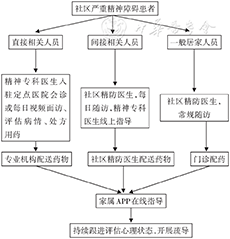 按照与疫情相关程度将社区严重精神障碍患者分为“直接相关人员”“间接相关人员”和“一般居家人员”。“直接相关人员”包括新冠肺炎的确诊、疑似病例以及无症状感染者,为重点关注人群。有条件的地区通过精神科医生入驻定点医院会诊开展诊疗,无法会诊时通过视频在线评估并远程处方用药,每日视频面访,给予专业支持。“间接相关人员”包括集中隔离医学观察者和居家隔离医学观察者,由社区精防医生随访,增加随访频次,精神专科医生线上专业指导用药。其他患者作为“一般居家人员”,采取常规随访,重视问题的早期发现和干预。具体流程见图1。