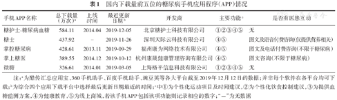 注:a为酷传汇总应用宝、360手机助手、百度手机助手、豌豆荚等各大平台截至2019年12月12日的数据;并非每个软件在各平台均可下载;b为综合四个应用下载平台中选择最后更新日期最近的时间;c中①为个性化运动项目及时间建议,②为个性化饮食控制建议,③为提供血糖监测方案,④为健康教育,⑤为线上商城,若该手机APP包括该项功能则记录相应的数字;“-”为无数据