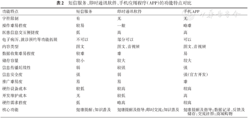 短信服务作为手机最基本的功能,无需专门配备智能手机和网络支持,以低成本、高效率、安全可靠等优势成为常用的沟通方式,且简单易学、方便存储,不易干扰患者的工作与生活,适用于中低收入国家和地区以及中老年患者居多的人群。不过,虽然有研究证明短信服务短期内可增强对疾病的认知和自我管理能力,但随着时间推移,患者可能失去对自我管理和改变行为的积极性[10]。同时,受限于短信服务的传播媒介(文字)及运营商,多数研究仅仅将其用于服药提醒及健康信息传播[14]。