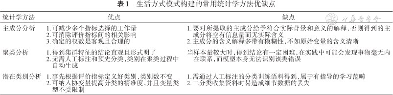 基于人群的生活方式行为数据,运用统计学方法获得生活方式模式,并对其进行命名分析,从而掌握同质人群中的生活方式情况,是一种无监督学习的方法。研究者通常根据研究目的和所期待的模式输出情况来自行选择方法构建生活方式模式,其中最常用的统计学方法包括:主成分分析、聚类分析和潜在类别分析[9, 10],三者优缺点比较(表1)[11, 12]。