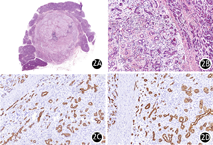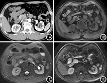 患者男性,63岁。以"腹胀伴腹痛半月"入院。半月前饭后出现上腹部腹胀伴腹痛,疼痛明显,呈持续性,无恶心呕吐,无发热寒战,无黑便腹泻。实验室检查:CAl25、CAl9-9、CEA、IgG4、淀粉酶均正常。腹部超声示胰腺头部低回声团块,边界尚清。上腹部增强CT示胰腺钩突部不均匀低密度肿块,约21 mm×18 mm,边界清楚,动脉期轻度强化,静脉期及延迟期呈明显强化,内部可见斑片状无强化区域(图1)。上腹部MR示胰腺钩突部团块状异常信号影,约21 mm×18 mm,病灶呈稍长T1、稍长T2信号,DWI呈稍高信号,内见斑片状长T1、长T2信号影(图1)。增强扫描见病变呈明显延迟强化,病灶与主胰管不相通。初步诊断:胰腺钩突神经内分泌肿瘤。1周后行胰头十二指肠切除术。切除的胰腺标本剖开后见大小20 mm×16 mm×16 mm肿物,切面呈灰白色,质韧,与周围分界清楚,有包膜。镜下见病灶由分化良好的腺泡及排列紊乱的导管构成,周围见纤维间质(图2)。免疫组织化学染色结果:CK7(+),CD56(-),CgA(-),Syn(-),Ki-67(+<5%),CK19(+)(图2)。病理诊断为胰腺错构瘤。术后随访6个月,患者恢复良好,无复发迹象。