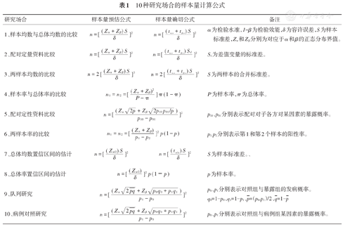 为了方便叙述,我们把10种研究场合的样本量计算公式总结于表1。