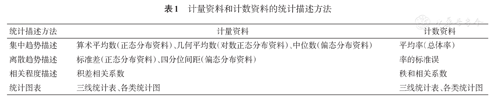 统计描述是指通过图表或数学方法,对抽样获得的样本数据资料进行整理、分析,并对数据的分布状态、数字特征和随机变量之间关系进行估计和描述的方法。统计描述一般包括集中趋势描述、离散趋势描述、相关程度描述和统计图表四部分。计量资料和计数资料的统计描述方法见表1。