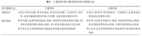 统计推断是指利用样本数据来推断总体特征的统计方法。统计推断一般包括利用样本信息推断总体特征的参数估计方法和利用样本信息判断对总体的假设是否成立的假设检验方法两部分。计量资料和计数资料的统计推断方法见表2。