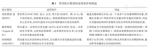 统计模型是指研究变量之间相互影响关系的数学模型,通常是利用抽样研究所得到的样本数据来拟合理论上的数学模型。在医学科研设计中,常用的统计模型包括线性模型(直线回归)、概率模型(Logistic回归)和时间模型(COX回归)[1]。常用统计模型的适用条件和用途见表3。