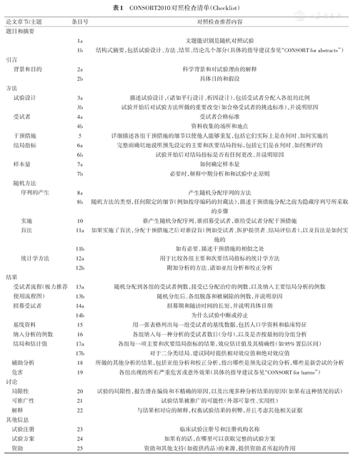 为了规范研究流程、提高研究质量,自20世纪90年代中期由国际多领域方法学专家组拟定,并于2010年更新修订以后一直沿用至今的CONSORT声明[5],对RCT研究报告的范式以声明的形式进行了公布。CONSORT声明条目有25条,由题目和摘要、引言、方法、结果、讨论、其他信息等六部分组成。CONSORT2010对照检查清单(Checklist)见表1。