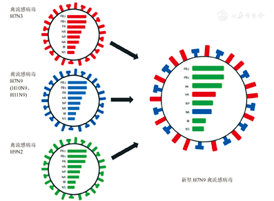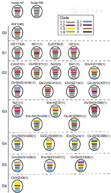 在人间流行的禽流感病毒一般认为来自甲型禽流感基因库(Avian influenza A gene pool),库中病毒的8个基因通过相互基因募集(gene recruitment)或发生突变,重配成新的病毒,多数新病毒因其基因不完整(缺失)或不协调存在时间短暂,也有少数以稳定形式长期存在于各种禽类中。其中极少数尚未知的机制突破种属屏障而传播至人类,决定跨种传播的主要是病毒的HA与NA,但病毒的聚合酶上的氨基酸突变也可能起一定作用。真正适应于人类并能在人间传播的新型病毒8个基因必须全部适应人体环境。为达到这一目的,新型病毒必须与真正人类流感病毒(H1N1、H2N2和H3N2)基因交换重配,但这是相当困难的。Cui等[13]对100多株H7N9禽流感病毒的基因信息进行了遗传谱系的分析,并对目前出现的27种病毒基因型绘制出了病毒动态重配(dynamic reassortment)模式(图3)。浙江大学医学院附属第一医院传染病诊治国家重点实验室李兰娟研究团队通过全序列分析发现,H7中的Gln226Leu(谷氨酸→亮氨酸)和Gly186Val(甘氨酸→缬氨酸)发生变异,聚合酶碱性蛋白PB2的Asp701Asn(天冬氨酸→天冬酰胺)也出现变异,使H7N9禽流感病毒容易感染人类,并指出如果又有PB2基因的627和701氨基酸位点同时发生变异,将会发生人际传播的可能,需提高警惕[3]。