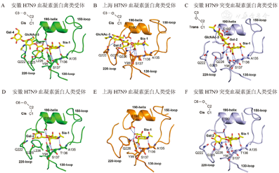 由于种属屏障的存在,大多数禽流感病毒仅在禽类中感染流行并不感染人类,但有些禽流感病毒是人畜共患病毒,在多种不同宿主感染过程中,病毒基因变异或重配产生新亚型而导致人类感染或增强其致病性。H7N9禽流感病毒是2008年从西班牙东北部(泰罗尼亚)的水鸭中首次分离出(A/Anas crecca/Spain/1460/2008)[7,8],后来相继在中欧、北美等地发现,一直以来被认为是低致病性禽流感病毒而未加重视。2013年3至4月初在我国上海、安徽等地区首次发现的人感染H7N9禽流感病毒是一种新型的重配病毒[上海株(A/Shanghai/1/2013)、安徽株(A/Anhui/1/2013)]。我国研究者Liu等[8]使用贝叶斯(Bayesian)进化分析,构建了该病毒基因系统进化树,认为新型H7N9禽流感病毒起源于野鸟和鸡群的多个基因重配(gene reassortment),其中HA基因片段可能源于长江三角鸭群的H7亚型禽流感病毒(ZJ12-H7N3),而NA基因可能源于某些迁徙候鸟(野鸟中KO14-H7N9)。另外6个内部基因与北京一带燕雀所携带的BJ12-H9N2病毒基因高度同源,经分析其基因片段可能来源于两组当地鸡群分离的不同H9N2禽流感病毒,其中1组非结构蛋白(NP)基因来自江苏周边的鸡群,而其他5个片段来自上海、浙江附近的鸡群(图1)[9]。此后,又有研究进一步表明,H7N9病毒NA基因也可能来源于华东地区野鸭中的H11N9病毒,以及鸡群中的H10N9病毒[10,11]。Shi等[12]发现安徽株(AH-H7N9,流行毒株)及上海株(SH-H7N9,个例株)在一级序列上具有各自的独特性,通过固相结合实验和表面等离子共振技术发现二株受体结合特性稍有不同,安徽株既能结合禽源受体,又能结合人源受体,而上海株却偏重于结合禽源受体,提示安徽株可能较易在人群中流行。研究者又解析了二株血凝素蛋白及其突变体与受体类似物的复合体结构(图2)[12],从而阐明了受体结合特性发生改变的结构基础。