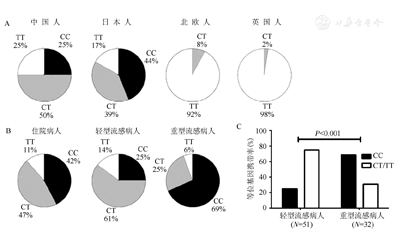 禽流感病毒感染后部分患者临床表现特别严重,迅速进展为中重度ARDS。研究发现发生中重度ARDS的危险因素包括年龄≥65岁,至少存在一种基础疾病,淋巴细胞计数低于1×109/L,天冬氨酸转氨酶水平高于40 U/L,肌酸激酶水平高于200 U/L,以及患者疾病发作到接受奥司他韦或者帕拉米韦治疗的时间大于3 d[37]。研究者尚发现人类对抗甲型流感病毒与个体遗传因素及携带一种特殊蛋白基因IFITM3(IFN-induced transmembrane protein 3,干扰素诱导跨膜蛋白3)表型差异有关,Quiñones-Parra等[38]通过对动物和人类研究提示,具有H7N9禽流感病毒肽呈现的人类白细胞抗原(HLAs)等位基因(占16%~57%),其交叉反应性CD8+T淋巴细胞对再感染会发生强烈应答,且与种族相关。又有Everitt等[39]研究发现少数人群携带一种"IFITM3基因",这种基因具有阻止禽流感病毒体进入到细胞质中,从而抑制病毒复制,当这种基因发生变异(SNP rs12252-C等位基因),可造成严重的病毒性疾病发生。据Zhang等[40]对国内甲型流感(H1N1/09)患者检测结果,发现重型患者中C/C占69%,轻型患者C/C只占25%(图4b,图4c),提示带有IFITM3 C/C变异者比带有T/C、T/T变异者临床症状严重得多,血浆中细胞因子(IL-6、IL-8、MIP-1β等)水平也高,但这种基因变异很少出现在白种人身上,但可频繁地出现在中国汉族人中(图4a)。因此,研究者认为IFITM3表型可作为"基因标志物",建议对禽流感病毒感染者筛查IFITM3表型,可预测其预后,有助于接受更合适治疗。