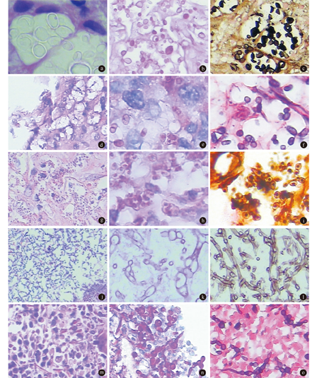 注:a.肺组织中隐球菌呈圆形及椭圆形,淡染,菌体周围有一明显的空晕(多糖厚荚膜不被着色)(HE×1 000); b.隐球菌的菌体及多糖胞壁呈紫红色(PAS×400); c.隐球菌的菌体及胞壁呈黑褐色(六胺银×400); d.腹膜组织中隐约可见马尔尼菲青霉菌呈蓝色,位于泡沫样空隙中呈圆形、椭圆形及杆状,体积较小(HE×400); e.马尔尼菲青霉菌呈明显的腊肠状,两端钝圆,中间有一横隔被染成紫红色,菌体粉染或紫色(PAS×1 000); f.马尔尼菲青霉菌菌体及横隔呈黑褐色(六胺银×1 000); g.腹腔活检组织中可见组织胞浆菌位于巨噬细胞内,呈圆形、椭圆形,淡篮染,菌核周围有空晕(HE×400); h.组织胞浆菌被染成紫红色,核周有空晕(PAS×1 000); i.组织胞浆菌被染成黄褐色,核被染成黑褐色,周围有空晕(六胺银×1 000); j.肺组织中见曲霉假菌丝呈分生孢子梗,部分孢子脱落,均呈淡蓝色(HE×100); k.曲霉被染成紫红色,菌丝呈小球和小囊状,有分枝(PAS×400); l.曲霉被染成黑褐色,有分隔,其分枝呈45°,假菌丝呈竹节样(六胺银×400); m.肝组织中见白色假丝酵母菌的孢子伸长成芽管,其内有空泡,另见厚壁孢子及假菌丝(HE×400); n.白色假丝酵母菌假菌丝带有球状的芽生孢子,厚壁孢子呈圆形(PAS×400); o.白色假丝酵母菌假菌丝和芽管均可见较短分枝,假菌丝有分隔,芽管呈葫芦状,大多孢子与菌丝不分离(六胺银×400)