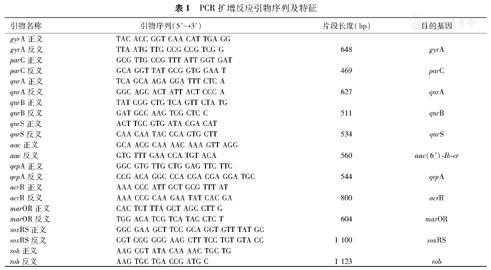 采用煮沸法提取细菌总DNA作为PCR反应的扩增模板。对菌株分别进行靶位酶基因gyrA、parC;质粒介导的喹诺酮耐药基因qnr,aac(6′) –Ib–cr,qepA及外排泵基因和调控基因acrR、marOR、soxRS及rob基因扩增,反应引物及特征见表1。反应体系为25 μL,其中Premix taq酶12.5 μL,ddH2O 9.5 μL,DNA模板1 μL,上下游引物各1 μL。PCR反应条件:94 ℃预变性5 min,94 ℃变性45 s,55℃退火1 min,72 ℃延伸1 min,共30个循环,72 ℃充分延伸10 min。取PCR反应产物1%琼脂糖凝胶电泳,溴化乙锭染色,凝胶系统下观察结果。对PCR反应产物测序,结果经Blast程序与GenBank数据库公布的标准菌序列进行比对。
