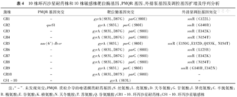注:"–".未发现突变;PMQR.质粒介导的喹诺酮类耐药基因;S.丝氨酸;L.亮氨酸;D.天冬氨酸;G.甘氨酸;I.异亮氨酸;C.半胱氨酸;R.精氨酸;E.谷氨酸;K.赖氨酸;N.天冬酰胺;T.苏氨酸;Q.谷氨酰胺;CR1~10.环丙沙星耐药株;CS1~10.环丙沙星敏感株
