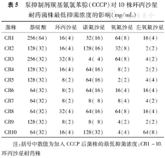 注:括号中数值为加入CCCP后菌株的最低抑菌浓度;CR1~10.环丙沙星耐药株