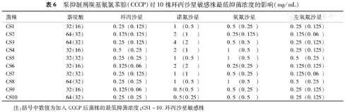 注:括号中数值为加入CCCP后菌株的最低抑菌浓度;CS1~10.环丙沙星敏感株