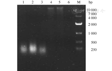 注:M.DNA标准带;1.加热裂解法;2.微波法;3.反复冻融法;4.溶壁酶法;5蜗牛酶法;6试剂盒法
