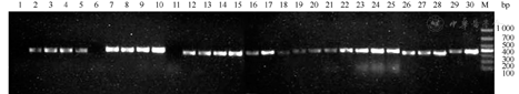 注:M.DNA标准带;1~5.加热裂解法提取各真菌DNA扩增产物;6~10.微波法提取各真菌DNA扩增产物;11~15.反复冻融法提取各真菌DNA扩增产物;16~20.试剂盒提取各真菌DNA扩增产物;21~25.溶壁酶法提取各真菌DNA扩增产物;26~30.蜗牛酶法提取各真菌DNA扩增产物。其中1、6、11、16、21、26为马尔尼菲青霉霉菌相;2、7、12、17、22、27为马尔尼菲青霉酵母相;3、8、13、18、23、28为白假丝酵母菌;4、9、14、19、24、29为新型隐球菌;5、10、15、20、25、30为小孢根霉