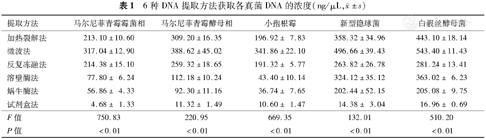 ±s表示,采用方差分析,不同提取方法所得DNA浓度和产率差异的两两比较用SNK –q检验。P<0.05为差异有统计学意义。