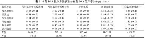 各种方法提取白假丝酵母菌、新型隐球菌DNA产率由高至低分别为:微波法>加热裂解法>反复冻融法>溶壁酶法>蜗牛法>试剂盒法(P<0.05);马尔尼菲青霉霉菌相、酵母相:微波法>加热裂解法>溶壁酶法>试剂盒法(P<0.05),加热裂解法和反复冻融法差异无统计学意义(P>0.05);溶壁酶法和蜗牛酶法差异无统计学意义(P>0.05);小孢根霉:微波法>加热裂解法>溶壁酶法(P<0.05),加热裂解法和反复冻融法差异无统计学意义,溶壁酶法和蜗牛酶法和试剂盒法差异无统计学意义(P>0.05)(表2)。