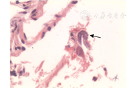 病例1 患者女,44岁,因"反复腹痛、腹胀1年,咳嗽、咳血丝痰2 d"于2007年11月8日入院。患者入院前1年因腹痛、腹胀外院行胃镜检查:胃黏膜活检示寄生虫感染,考虑蛔虫感染,未进一步治疗,1月前再发上腹闷胀痛、纳差、呕吐,伴有发热,体温最高38.5℃,入院前10 d外院就诊查胃镜示"浅表性胃炎",予治疗后症状缓解(具体不详)。入院前2 d出现咳嗽,伴有咳血丝痰,量少,伴气喘、夜间盗汗,仍有腹痛、纳差,为进一步治疗,来我院诊治。入院体检:体温36.6 ℃,脉搏106次/min,呼吸22次/min,血压111/65 mmHg(1 mmHg=0.133 kPa)。神志清楚,贫血、消瘦外观。右肺呼吸音减低,右下肺可闻及少许干啰音,未闻及湿啰音。脐周轻压痛,无反跳痛。11月8日实验室检查,血气分析:pH 7.41,二氧化碳分压35 mmHg,氧分压85 mmHg;血常规:白细胞(WBC)计数10.8×109/L,嗜中性粒细胞0.864,嗜酸性粒细胞0.025,血红蛋白(Hb)67 g/L;血生化:空腹血糖8.3 mmol/L,白蛋白(Alb)31.0 g/L,肌酐70.7 μmol/L,胸部X片示双肺絮状阴影、结节影。11月9日胸部CT示双肺弥漫性病变。支气管镜肺泡灌洗液呈砖红色,肺泡灌洗液涂片见寄生虫虫体;肺活检病理示其中1个肺泡腔见一条细长丝状幼虫,长约0.6 cm,尾端分叉、苏木精–伊红着色,考虑粪类圆线虫感染(图1)。11月8日开始予加替沙星(0.2 g,2次/d)抗感染,11月10日予阿苯达唑(0.4 g,1次/d)抗寄生虫等治疗,患者于11月12日出现神志不清,胃液及尿液均检出寄生虫,经漳州市疾病预防控制中心鉴定为粪类圆线虫,考虑播散型粪类圆线虫感染。患者病情重,血氧饱和度进行性下降,患者放弃治疗于11月15日办理自动出院。