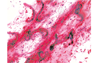 病例2 患者男,68岁,以"咳嗽4个月余,纳差、黑便10余天,气喘4 d"于2014年3月21日入院。入院前4个月出现咳嗽,伴咳痰,痰少白黏,于当地诊所服药治疗(具体不详),症状有所缓解。入院前10余天出现纳差、伴有腹胀,呕吐胃内容物,解黑便,当地医院就诊行胃镜检查示:慢性胃窦炎,胆汁返流,食管炎。入院4 d前咳嗽加剧,伴气喘,尿量减少,2 d前出现双下肢浮肿,为进一步治疗,来我院诊治。既往史无特殊。体检:体温36.9 ℃,脉搏100次/min,呼吸26次/min,血压:79/43 mmHg。神志清楚,消瘦外观,贫血面容,呼吸急促。桶状胸,双肺可闻及明显干湿性啰音。双下肢中度凹陷性浮肿。3月21日血气分析:pH 7.53,二氧化碳分压34 mmHg,氧分压48 mmHg;血常规:WBC 20.97 ×109/L,嗜中性粒细胞比例0.787,嗜酸性粒细胞0.07,Hb 47 g/L;血生化:丙氨酸转氨酶(ALT) 54.6 U/L,Alb 18.7 g/L,肌酐59.8μmol/L;尿常规:尿蛋白(–),尿隐血(++)。3月21日胸部X线示双肺弥漫性絮状影。3月22日予纤维支气管镜引导下行气管插管接呼吸机辅助呼吸,美罗培南(1 g,3次/d)联合莫西沙星(0.4 g,1次/d)抗感染,同时给予强心、利尿、升压、输血等治疗,并行纤维支气管镜吸痰寻找病原体。3月28日痰液细胞学及离心涂片:苏木精–伊红染色可见数条细长丝状幼虫虫体,卷曲状,咽管呈柱状,尾端尖,诊断粪类圆线虫(丝状蚴)(图2)。粪便中未找到寄生虫,3月28日加用阿苯达唑(0.4 g口服,2次/d)抗寄生虫治疗。4月2日复查肺部灌洗液涂片:虫量较前明显减少,后患者再次出现发热,血压低。4月4日总IgE 13.4 IU/mL,患者因经济原因于4月5日办理自动出院。