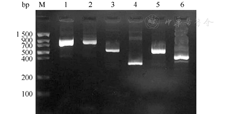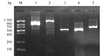 注:M.标准带;1.K57(1 037 bp); 2.K1(1 283 bp); 3.rmpA(536 bp); 4.aerobaction(556 bp); 5.FimH-1(688 bp)