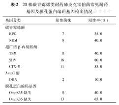 20株CRKP中,14株产碳青霉烯酶菌株对亚胺培南、美罗培南和厄他培南完全耐药;2株产EBSLs合并OmpK35/OmpK36外膜孔蛋白编码基因缺失时,对上述3种碳青霉烯类抗菌药物耐药;另有2株携带SHV、TEM和CTX-M基因,改良Hodge试验、EDTA双纸片试验均阴性,但对3种碳青霉烯类抗菌药物耐药;仅2株产SHV和CTX-M菌株,碳青霉烯酶表型试验均阴性,其中1株对亚胺培南中介,对美罗培南、厄他培南耐药,另1株对亚胺培南和美罗培南敏感,厄他培南耐药。