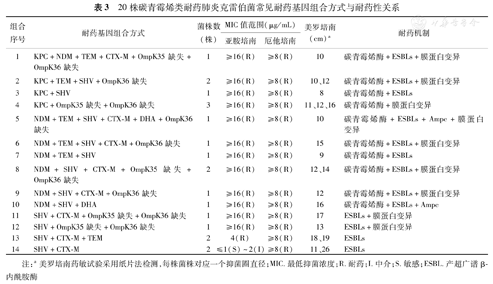 20株碳青霉烯类耐药肺炎克雷伯菌常见耐药基因组合方式与耐药性关系