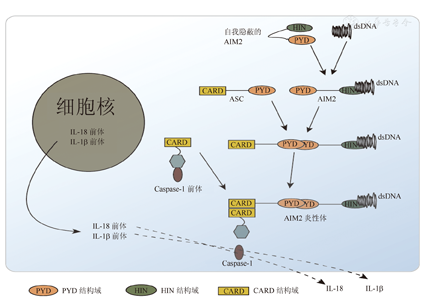 衔接子ASC的基因位于染色体16p11.2-12,蛋白由195个氨基酸构成,分子量为22 000[14]。ASC的N端有PYD结构域,C端有CARD结构域,它可以作为一种接合器连接有PYD结构域的蛋白质与有CARD结构域的蛋白质。ASC与AIM2通过各自的PYD结构域相互连接,ASC通过自身CARD结构域连接Caspase-1的CARD结构域而募集并激活Caspase-1[15]。研究ASC-/-小鼠显示,ASC对激活Caspase-1和促进IL-1β的成熟必不可少,说明ASC对调节炎性体信号通路非常关键,但其具体机制尚未完全阐明[16]。