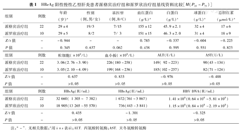 HBeAg阳性慢性乙型肝炎患者派格宾治疗组和派罗欣治疗组基线资料比较[M(P25~P75)]