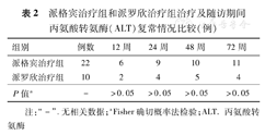 派格宾治疗组与派罗欣治疗组治疗及随访期间的ALT复常情况见表2,两组各时间ALT复常率比较差异无统计学意义(P>0.05)。