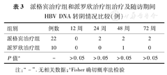 派格宾治疗组与派罗欣治疗组治疗及随访期间的HBV DNA转阴情况见表3,两组各时间点HBV DNA转阴率比较差异无统计学意义(P>0.05)。