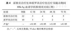 派格宾治疗组与派罗欣治疗组治疗及随访期间的血清学应答情况见表4,两组各时间点HBeAg血清学转换率比较差异无统计学意义(P>0.05)。