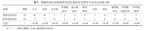 两组治疗过程中最常见的不良反应有乏力、发热、脱发、肌肉酸痛等,派格宾组分别为16、18、8和7例,派罗欣组分别为7、7、4和5例,其中派格宾治疗组有7例患者发生视网膜病变,其中1例患者因症状严重停药1个月。两组患者各种不良反应的发生率比较差异无统计学意义(P>0.05),见表5。