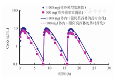 体外PK/PD模型显示,给药剂量药物浓度变化与口服阿莫西林相同剂量后体内变化一致,模拟效果见图1。