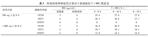 阿莫西林两种给药方案对3株菌株的T>MIC数值表