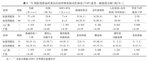 | 组别 | 例数 | 年龄(岁, ±s) | 性别(男/女) | SOFA评分(分, ±s) | 脓毒性休克 | 急性肾损伤 | 入住原因(内科疾病/外科疾病) | 早发VAP/晚发VAP |
