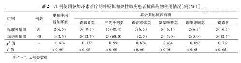 71例使用替加环素治疗的呼吸机相关性肺炎患者抗菌药物使用情况[例(%)]