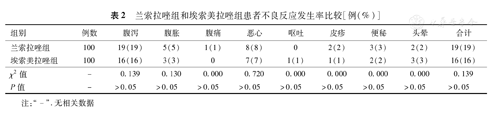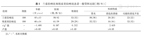 兰索拉唑组和埃索美拉唑组,两组在性别、年龄、吸烟史、疾病构成比上差异无统计学意义,具有可比性(表1)。