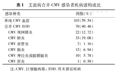 173例CMV感染者中,103例(59.54%)存在CMV血症,但无CMV终末器官疾病(End-organ disease,EOD),70例(40.46%)合并CMV EOD,其中CMV肺炎33例(19.08%),CMV视网膜炎22例(12.72%), CMV肠炎12例(6.94%),CMV神经炎或脑膜脑炎10例(5.78%),CMV食管炎2例(1.16%),CMV肝炎1例(0.58%),有10例(5.78%)患者同时出现两种CMV EOD疾病(表1)。