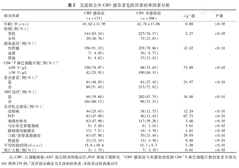 收集武汉大学中南医院感染科2015年6月至2016年8月收治的AIDS患者471例,其中合并CMV感染患者173例,男性144例,女性29例,年龄(41.62±11.95)岁;未感染CMV患者298例,其中男性227例,女性71例,年龄(42.78±13.06)岁。