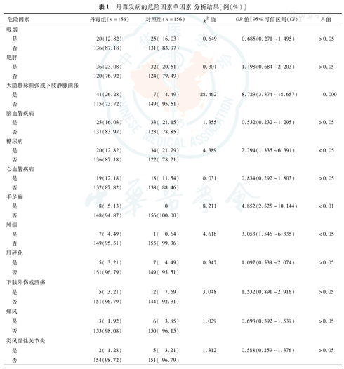 | 危险因素 | 丹毒组(n=156) | 对照组(n=156) | χ2值 | OR值[95%可信区间(CI)] | P值 | |