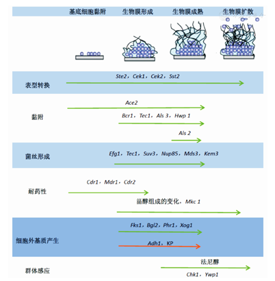 白假丝酵母菌生物膜的形成过程主要包括:基底细胞粘附、生物膜初步形成、生物膜的成熟以及扩散。目前,对于白假丝酵母菌生物膜形成的主要影响因素大致可以分为以下几种:细胞外基质、群体感应、外排泵及形态转换等。图1为影响白假丝酵母菌生物膜形成各阶段的具体作用因素。