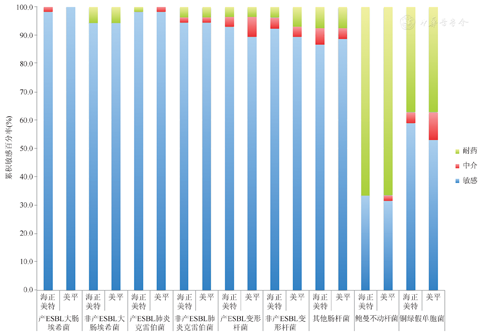 海正美特与美平对肠杆菌科细菌均具有良好的体外抗菌活性,对鲍曼不动杆菌和铜绿假单胞菌的敏感率均较低。两种美罗培南对ESBLs稳定,对主要革兰阴性菌的体外抗菌活性无差异。