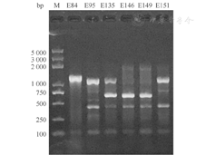 ERIC-PCR分型发现4种克隆群:A(E146、E149)、B(E95、E151),C(E84)和D(E135),结果见图1。