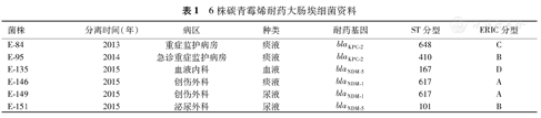 6株产碳青霉烯酶大肠埃希菌中,PCR检测出3种碳青霉烯酶基因,即blaKPC-2、blaNDM-1、blaNDM-5各2株。菌株临床资料见表1。