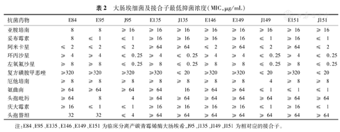 大肠埃细菌及接合子最低抑菌浓度(MIC,μg/mL)
