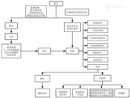 应根据年龄、发病季节、流行病学、临床和影像学表现特点、病情严重度、有无基础疾病以及实验室检查等综合分析可能的病原,重点是及早经验性识别出潜在的重症细菌性肺炎、重症难治性支原体肺炎、腺病毒肺炎以及流感病毒肺炎等,实施针对性经验治疗,以降低病死率和减少后遗症。