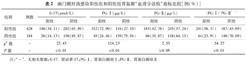 幽门螺杆菌感染阳性组和阴性组胃黏膜"血清学活检"指标比较[例(%)]