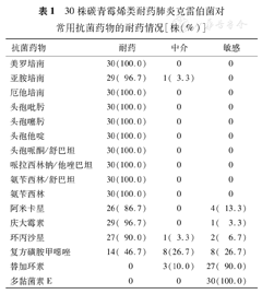 30株碳青霉烯类耐药肺炎克雷伯菌对常用抗菌药物的耐药情况[株(%)]