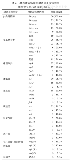 30株碳青霉烯类耐药肺炎克雷伯菌携带常见耐药基因型[株(%)]